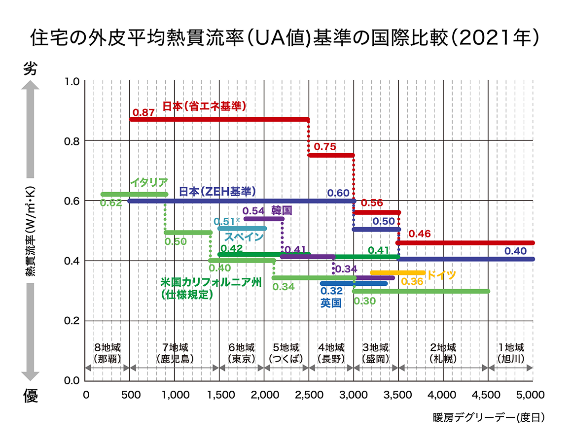 ※各国の住宅の省エネ基準をもとに作成※スペインでは5つの地域区分に分類されるが、上図ではマドリードが属する地域区分のみの数値