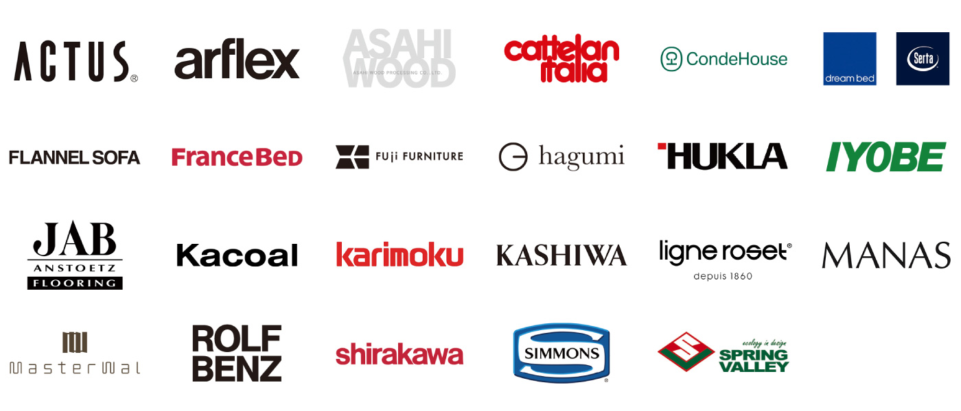 アクタス / 朝日木材加工 / アルフレックスジャパン / 綾野製作所 / イヨベ工芸社 / エスティック / カコール / 柏木工/ カッテランイタリア / カリモク家具 / カンディハウス / シラカワ / 日本フクラ / 富士ファニチア / フランネルソファ / マスターウォール / リーンロゼ / ロルフベンツ