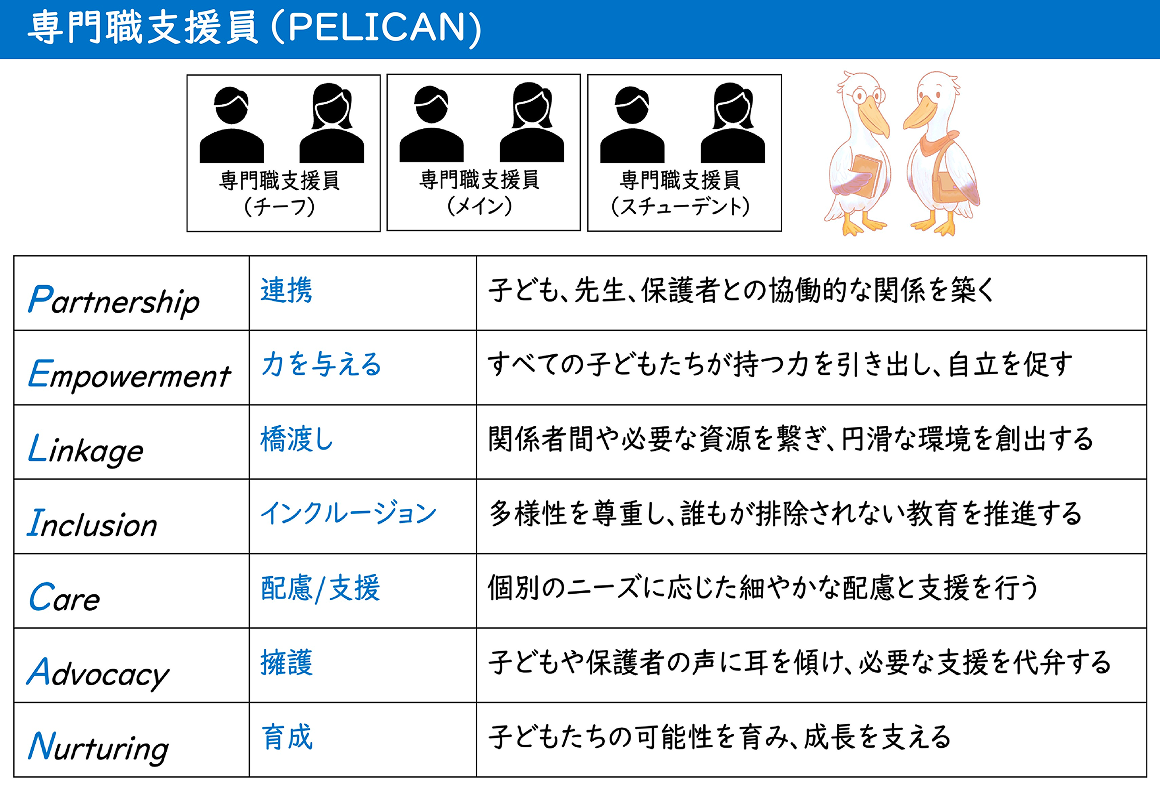 この専門職支援員のことを、D&I教育研究実践センターでは「Partnership(協働)」、「Empowerment(力を引き出すこと)」、「Linkage(つなぐこと)」、「Inclusion(包摂)」、「Care(配慮)」、「Advocacy(代弁)」、「Nurturing(育成)」の頭文字をとって「PELICAN(ペリカン)」と呼んでいます。