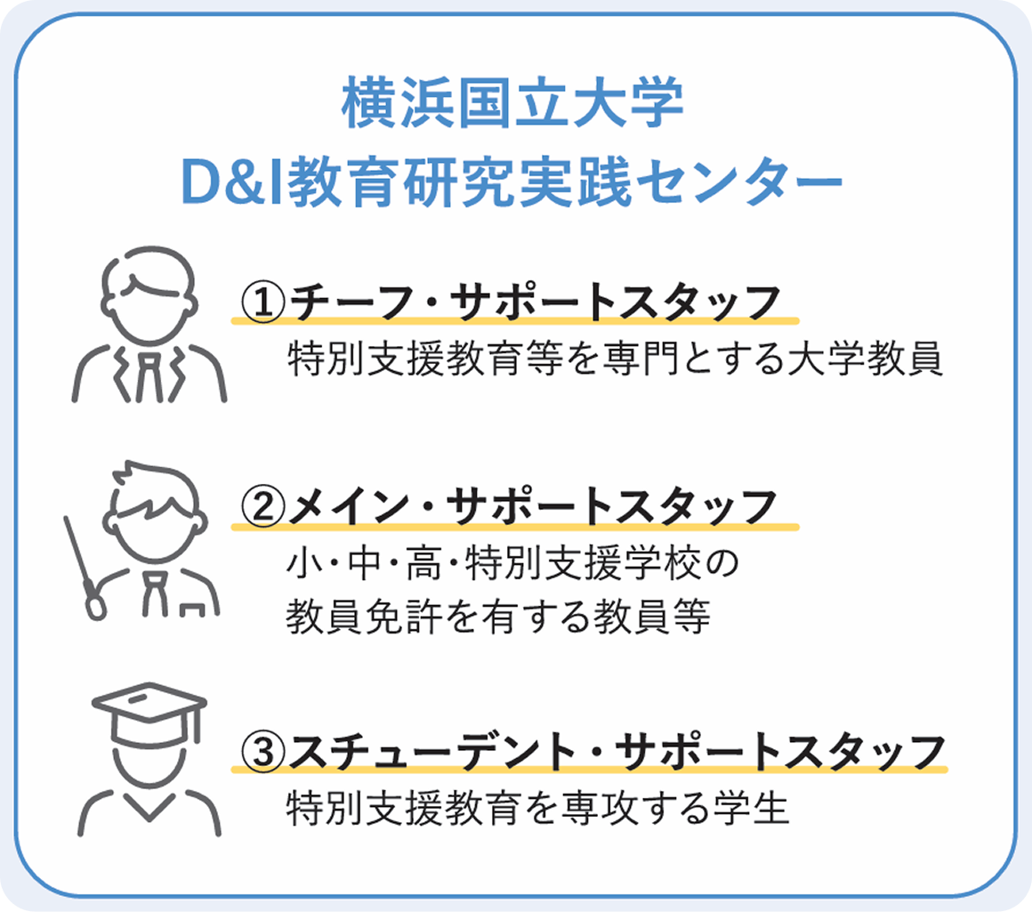 さらに個々のスキルや立場に合わせて、「スチューデント・サポートスタッフ」「メイン・サポートスタッフ」「チーフ・サポートスタッフ」とレベルを分類。スチューデント・サポートスタッフは特別支援教育を専攻する学生、メイン・サポートスタッフは小・中・高等学校や特別支援学校の教員免許を有する教員等、チーフ・サポートスタッフは特別支援教育等を専門とする大学教員が対象となっており、それぞれのレベルに応じた専門性を活かし、学校現場での支援に取り組んでいます。
