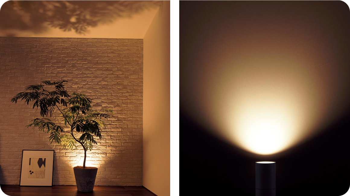 たとえば、床置きの小さなLED照明で観葉植物を照らすと、葉の陰影がくっきりと際立ち、壁や天井に浮かび上がる影はまるでアート作品のよう。このように影を映し出す照明手法は「シャドウライティング」と呼ばれ、空間に深みやドラマチックな表情を生みだします。