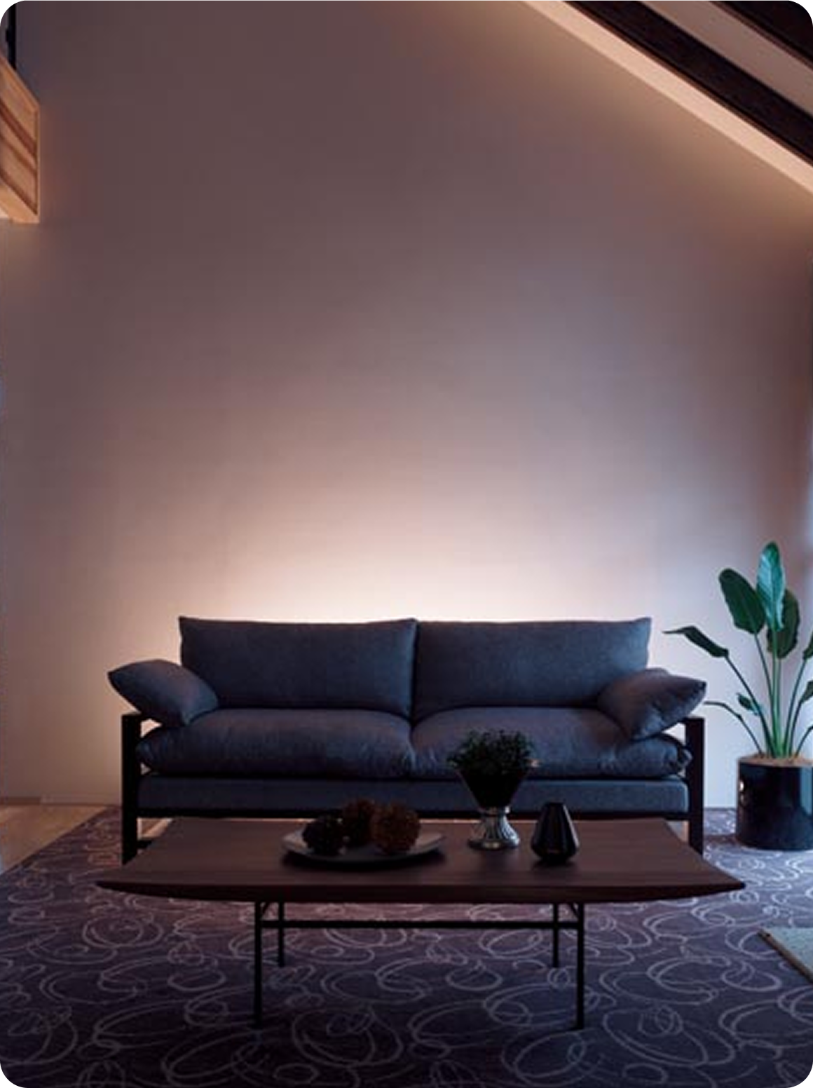 たとえば、ソファや家具の背面、ベッドのヘッドボード裏などに小さな照明を仕込めば、壁に沿って広がる光の中にシルエットが浮かび上がり、ロマンチックな雰囲気に。