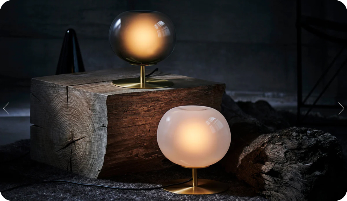 思わず触れたくなるような、なめらかなデザイン。ガラスはマウスブローで制作。点灯するとグレーは夜霧の中で、ホワイトは朝霧の中で光を灯したようにほのかに光ります。奈良に拠点をおく照明ブランド(FOG/NEW LIGHT POTTERY)