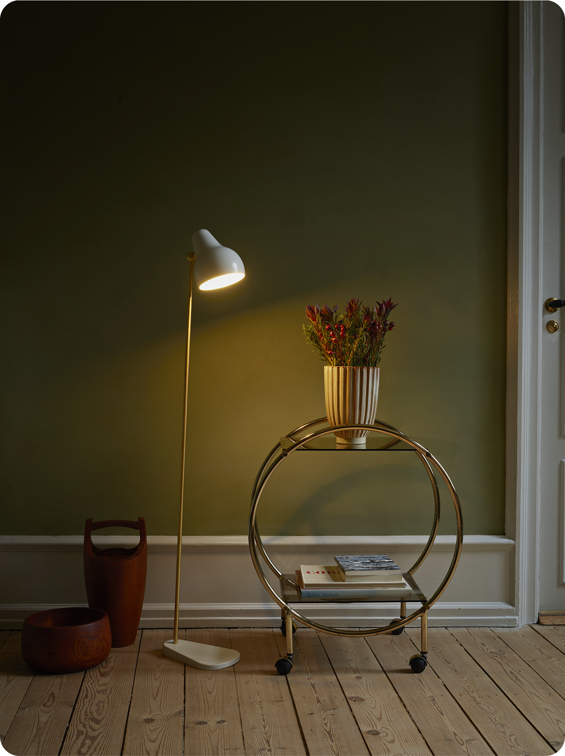 ころんとしたフォルムがレトロでありながら、モダンを感じさせるタイムレスなデザイン。シェードは可動式なので手元を照らしたり、床を照らしたり、さまざまなシーンで活躍します(VL38 フロア/ルイスポールセン)