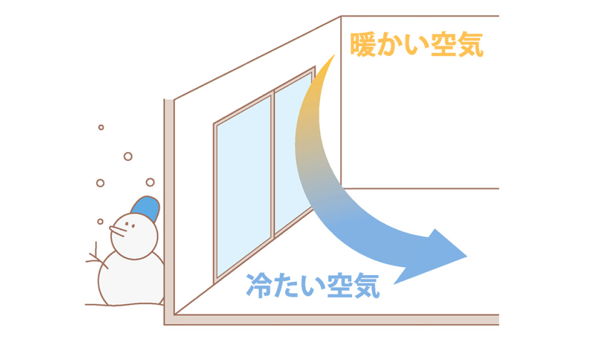 冷たい窓に暖かい空気が触れると急速に冷やされ、その冷気は対流で下方へと流れます。これを「コールドドラフト現象」といいます(資料提供:LIXIL)